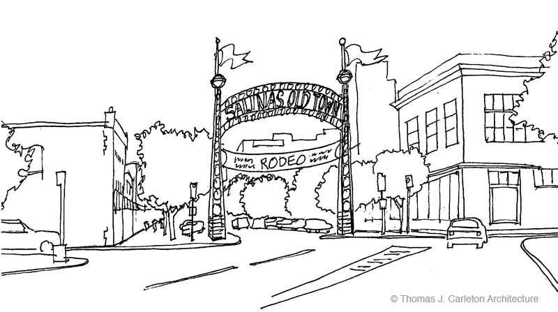 A number of small cities in northern California, such as Castroville and Pleasanton, have had the foresight to erect archways to mark the entrances to older retail sections of town. From time to time, the Old Town Association has promoted the concept of one or more gateways in downtown Salinas. We have volunteered a number of ideas in the past. The sketch shown here presents two metal towers supporting an arch which spans over Main Street at San Luis Street. Banners could be hung from the towers and changed for periodic events. Vegetable medallions could be added to the towers to give tribute to the valley’s agriculture industry. Like the recently painted railroad bridge on North Main Street, a new gateway would contribute to civic pride.