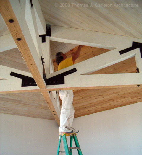 Bill and Clara Keller are enjoying a distinctive addition to their ranch home on the higher properties along San Benancio Canyon Road. You might describe it as living in a pyramid. TJC designed the floor plan of their new guest room as a square (with four walls of equal length at ninety degree angles to each other). Above is a pyramid-shaped ceiling (four triangles sloping toward a peak). Do you remember these shapes from high school Geometry class? The wood trusses, crossing from corner to corner, actually hold up the roof. These were structurally engineered by Rene Bravo P.E. and custom fabricated for this project by Roux Construction. It was particularly enjoyable working with the Kellers. They tell me that they often lounge in their new dynamic space while enjoying the long views toward Salinas Valley through the wall of windows. -TJC