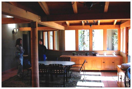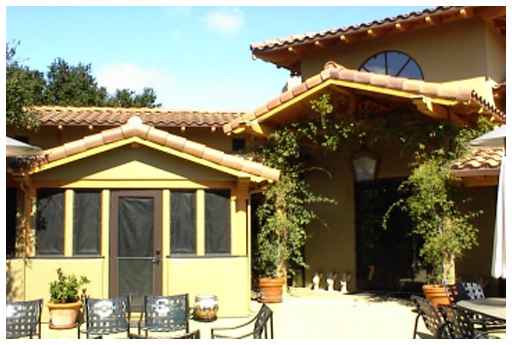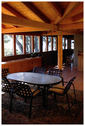 This 6,000 square-foot hacienda in Chualar Canyon was designed by TJC in 1990 at another firm. The owners returned to add a screened porch onto the south-facing patio. They requested an informal space to relax with their grandchildren. The roof structure is exposed. The original materials are extended into the new porch -- roofing, plaster and floor tile.